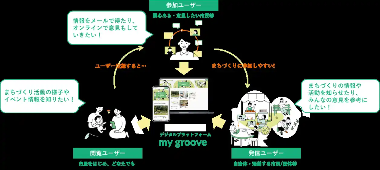 参加を通じて、市民が当事者としてともにまちに関わるプロセスを設計・可視化する、地域エンゲージメントの基盤です。 |