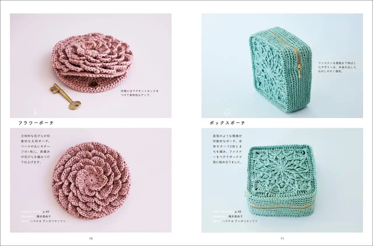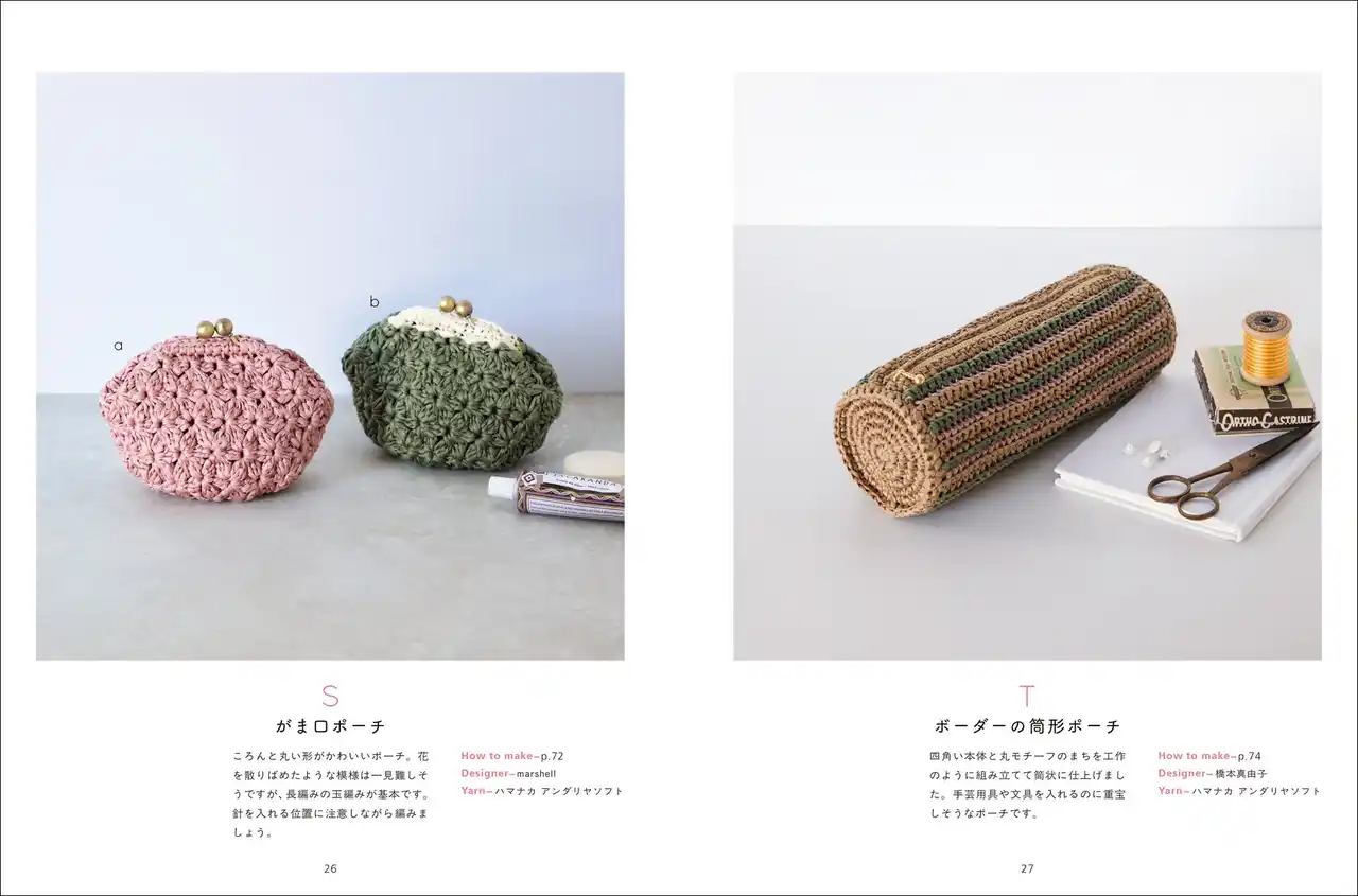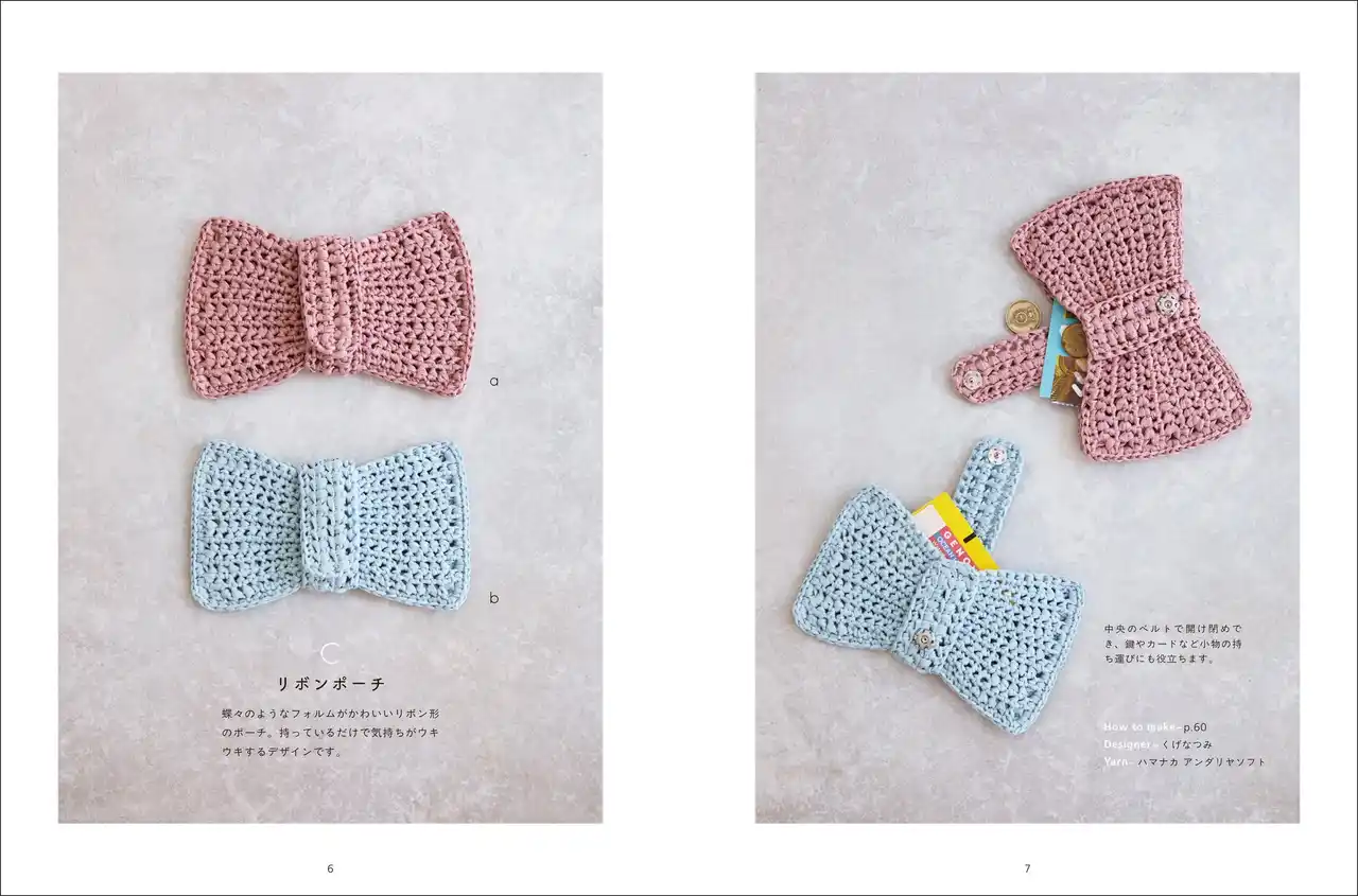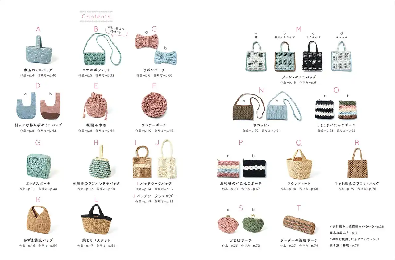| 小物の整理に役立つ巾着、ポーチなど、いくつも編みたくなる作品ばかりです。 | |||||