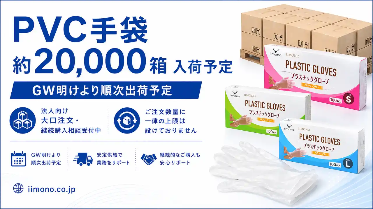 | 株式会社ベター・テック(本社:東京都中央区、以下「当社」)は、法人向け使い捨て手袋専門サイト「iimono.co.jp」において、PVC手袋約20,000箱の入荷を予定していることをお知らせいたします。 | |||