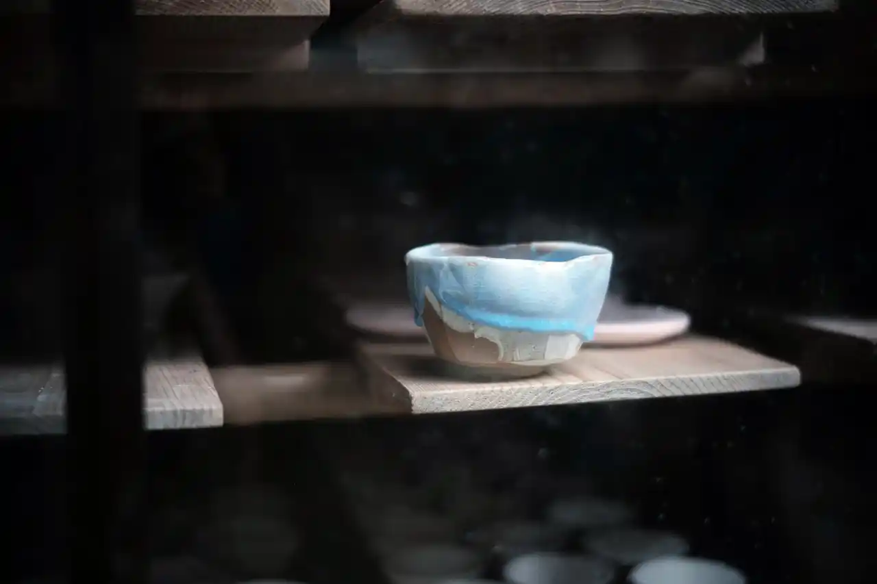 | 会場となるレストラン「ヌーヴェル・エポック」には、豊斎氏が手掛けた淡いブルーの釉薬「月白釉(げっぱくゆう)」よって「きれいさび」を表現した3点の作品が展示されています。個室の飾り棚に象徴的に配された茶盌や、竹細工のシェルフで存在感を放つ器など、いずれも当ホテルのために制作された作品です。朝日焼が400年の歴史で紡いできた趣を、間近でご体感いただけます。 | |||||