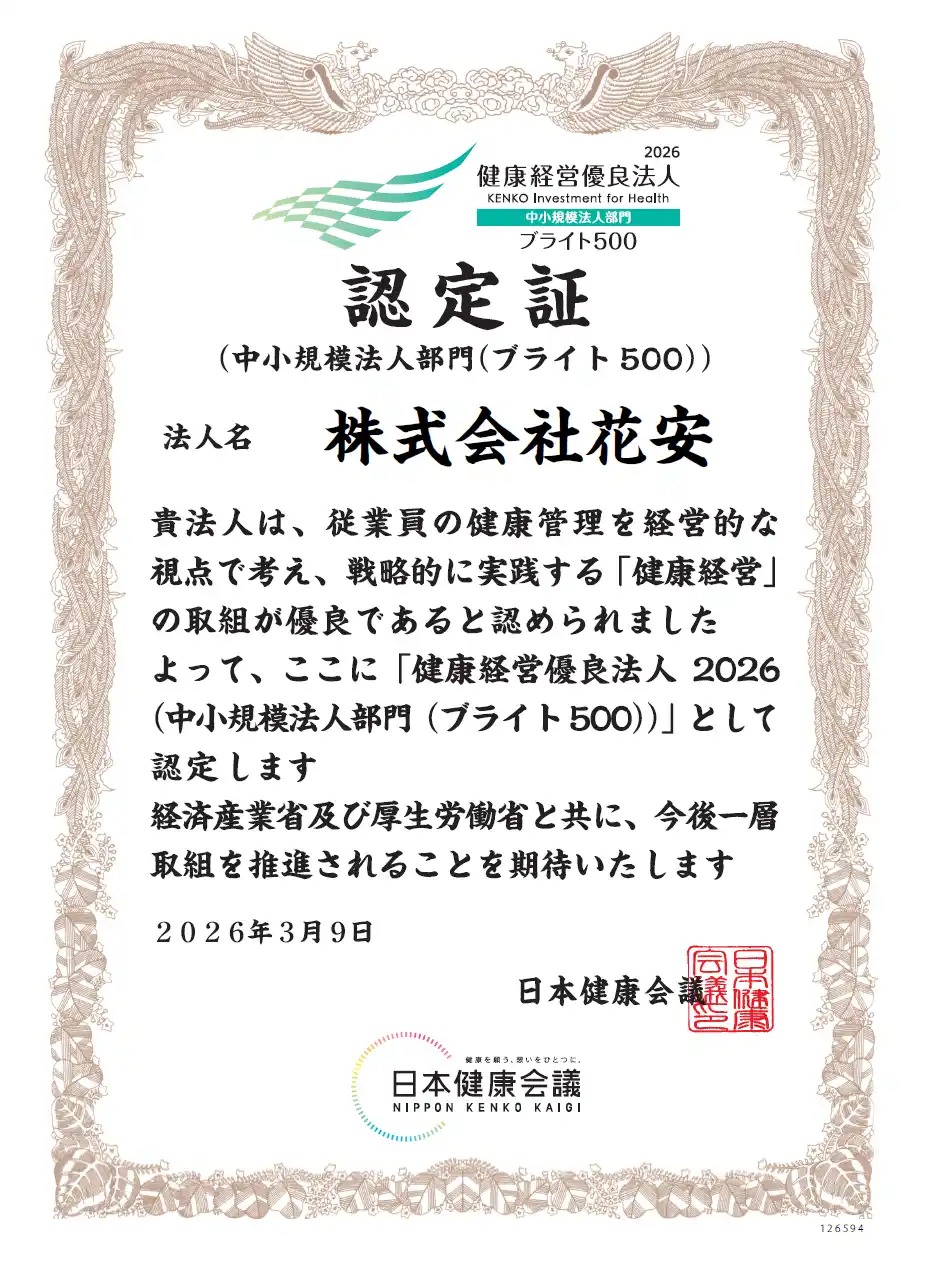 株式会社花安は、経済産業省および日本健康会議が認定する「健康経営優良法人認定制度」において、以下の通り認定を取得いたしましたことをお知らせいたします。 |