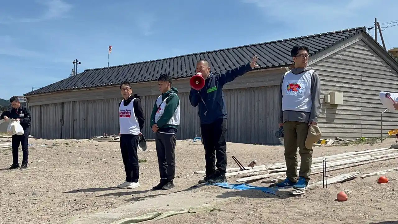 開催場所となる黒島地区は、2024年元旦の能登半島地震により海岸線が約80キロに渡り隆起し、最大5.5m海底が上がりました。その影響から砂浜が生まれ、大量の海洋ごみが漂着しています。 |