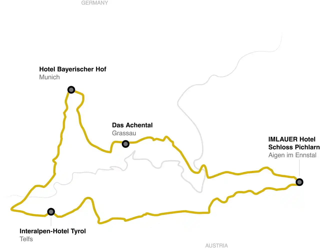 | 2026年7月の4つの出発日(7月5-9日、11-15日、17-21日、23-27日)で催行される本プログラムは、ミュンヘンを起点に5日間でヨーロッパ屈指のドライブルートを巡ります。ハンテンヨッホ峠、ゲルロス峠、そしてチロルやシュタイアーマルクの美しい山岳ルートなど、壮大な景観の中を走り抜けます。旅の途中では、ドイツ・ミュンヘンの 「Hotel Bayerischer Hof」、オーストリア・テルフス=ブーヘンの「 Interalpen-Hotel Tyrol」、オーストリア・アイゲン・イム・エンスタールの 「Imlauer Hotel Schloss Pichlarn」、そしてドイツ・グラッサウの 「Das Achental」 といった、プリファードホテルズ&リゾーツの加盟ホテルにご滞在いただきます。 | ||||||||||||||