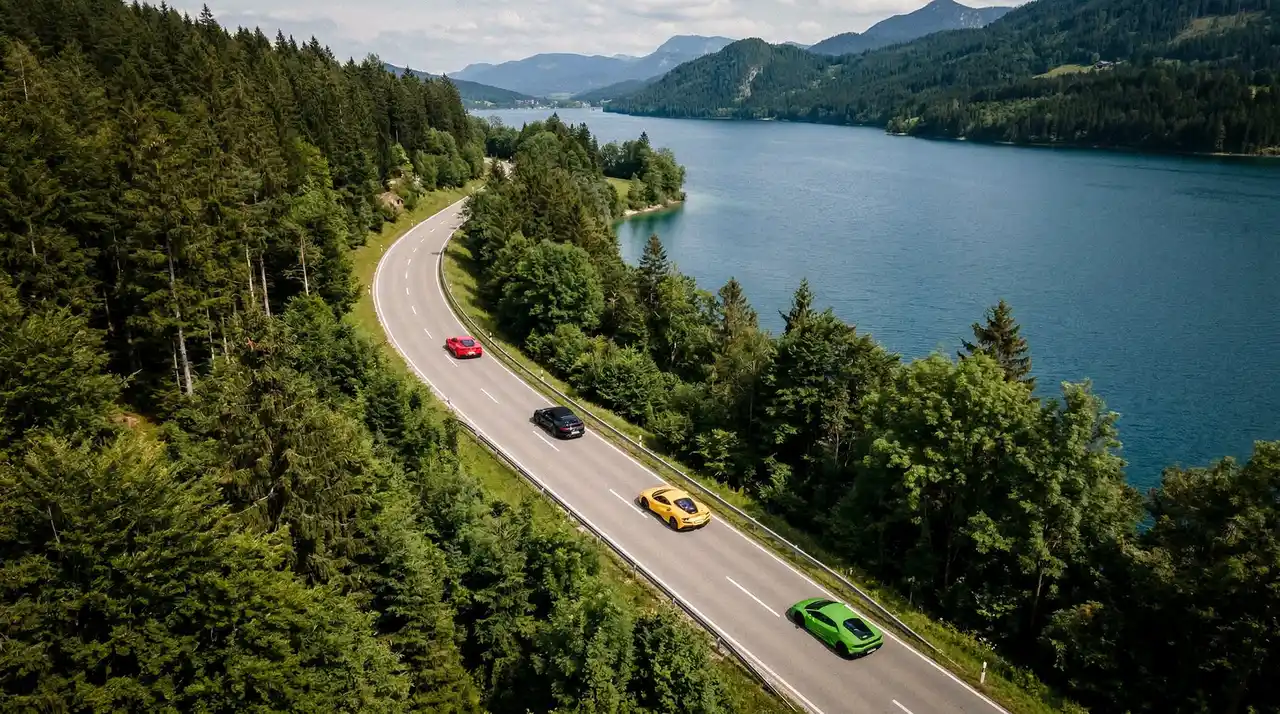 チロル(オーストリア)|2日目 Motorworld Munich を訪れた後、参加者は専用のスポーツカーに乗り込み、最初のアルプスドライブへ出発。ターコイズブルーに輝くプランゼー湖や、カーブが続くハンテンヨッホ峠など、絶景ルートを走り抜けます。宿泊は Interalpen-Hotel Tyrol。パノラマビューと洗練された5コースディナーをお楽しみいただきます。 |