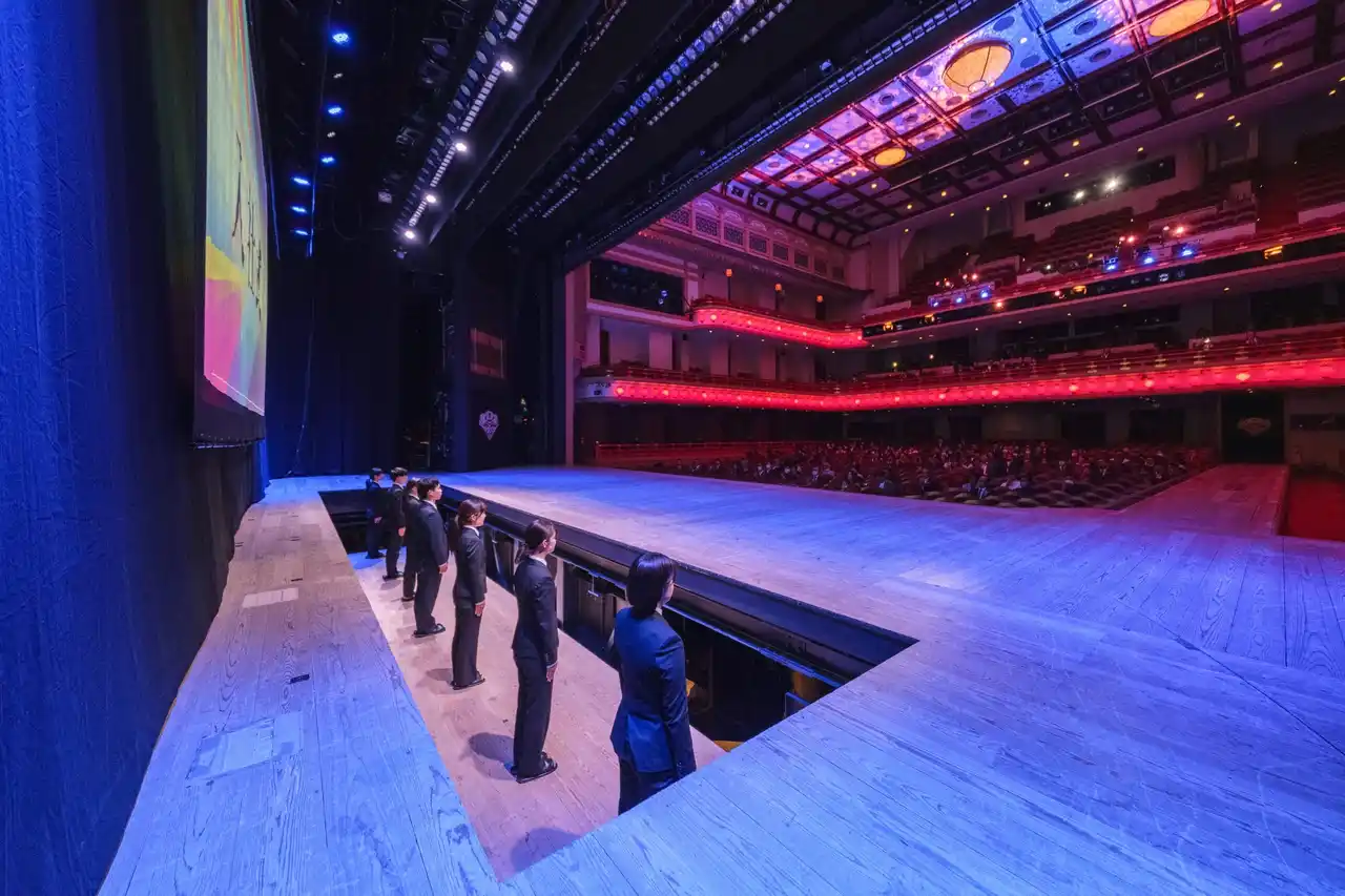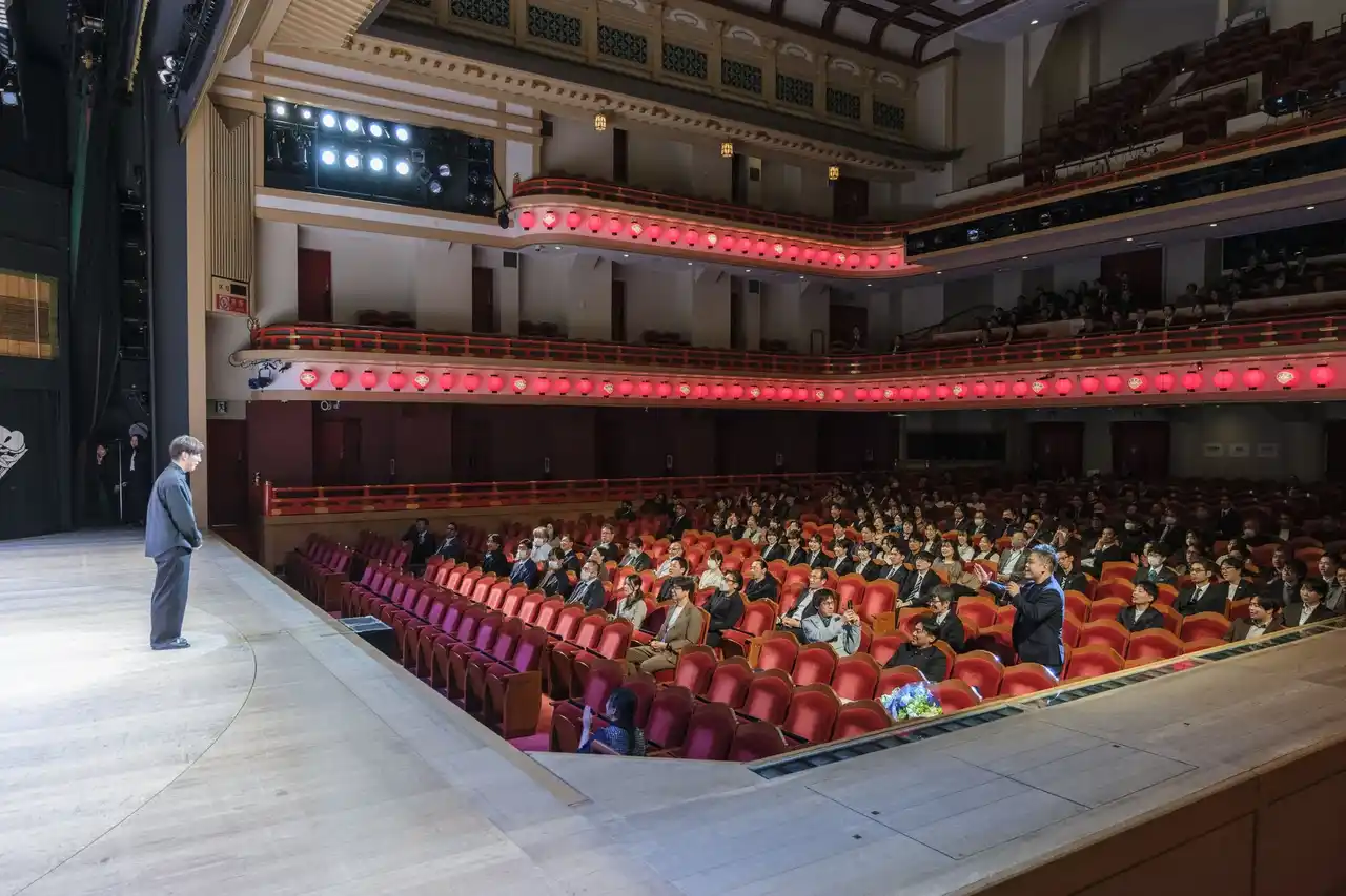 その感動の余韻の中、第1部後半では2026年度新入社員7名の入社式が執り行われました。歌舞伎座ならではの舞台機構である「せり」から登場した新入社員たちは、一人ずつセンターマイクの前に立ち、自らの「原点となる言葉」と未来への意気込みを力強く発表しました。 長きにわたり技術と精神を守り抜いたベテラン社員から、次なる成長の原動力となる新入社員へとバトンが受け継がれる象徴的な時間となりました。 |