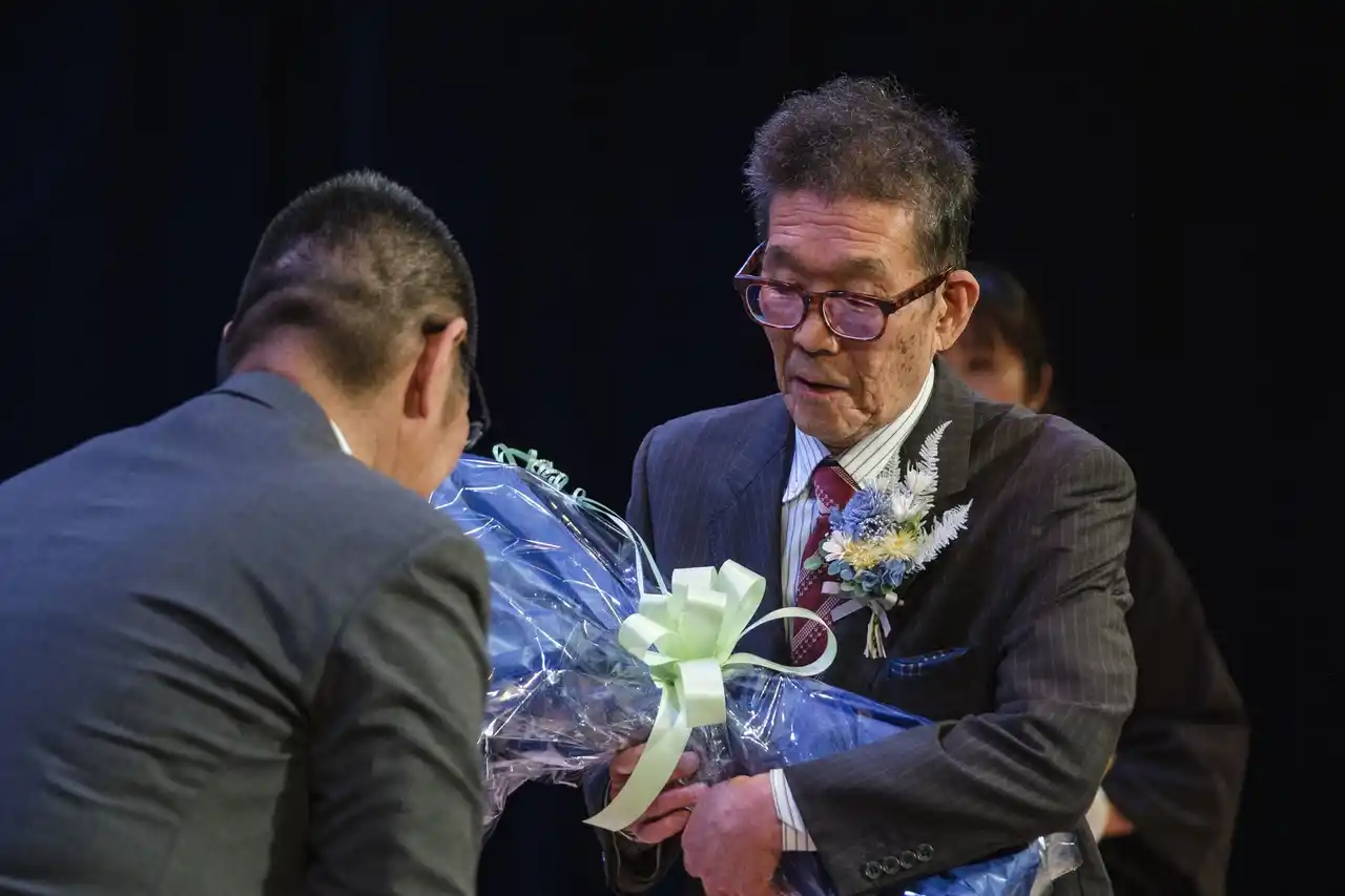 式典の幕開けは、会社の原点である創業者の想いや歴史をたどるムービーの上映。その後、当社初となる勤続50年の特別表彰が執り行われました。南座の舞台で花束を受け取り、これまでの歩みと「わたしの原点」を語るベテラン社員の姿に、会場全体が温かな感動と万雷の拍手に包まれました。 |