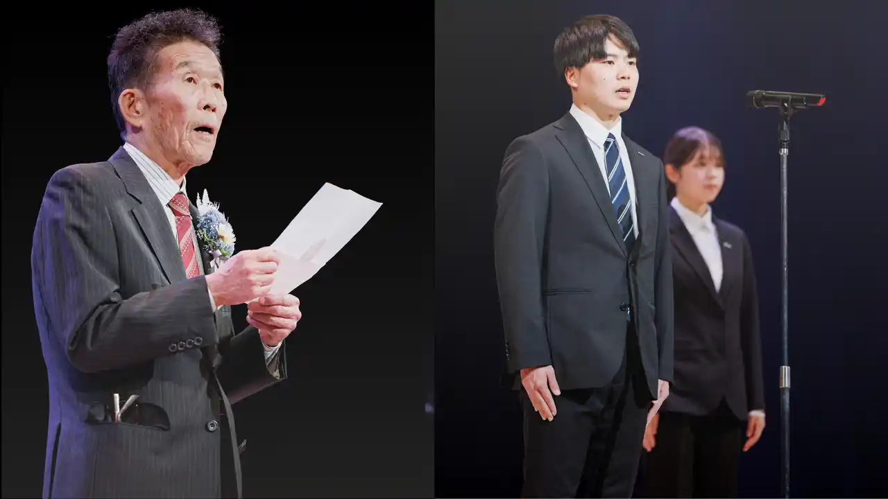 本年の式典テーマは「原点」。変化の激しい時代に合わせた組織改革が進むなか、企業の「原点」である創業者の想いを振り返るオープニング映像から始まり、これまでの歩みを見つめ直すべく原点回帰を掲げました。当日は、高度経済成長期から半世紀にわたり会社を支え続けた50年勤続のベテラン社員と、これから社会人としての第一歩を踏み出す新入社員が同じ舞台に登壇し、世代を超えて互いの功績と未来への決意を讃え合いました。 |