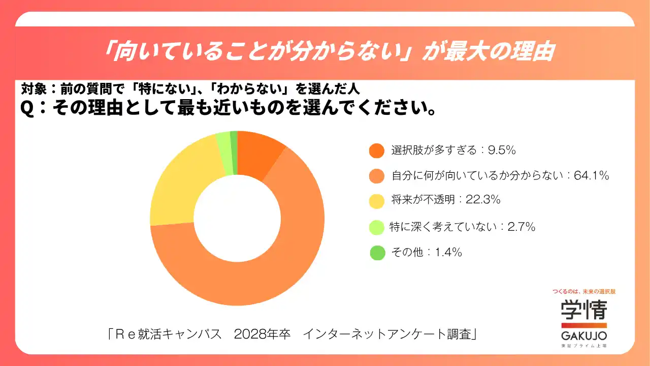 | 「やりたい仕事がない/分からない」と回答した層(n=220)に理由を尋ねたところ、「将来が不透明」「選択肢が多い」といった環境要因もある一方、中心にあるのは「自分に合う仕事が分からない」という自己理解の難しさであることが示されています。 | ||||||