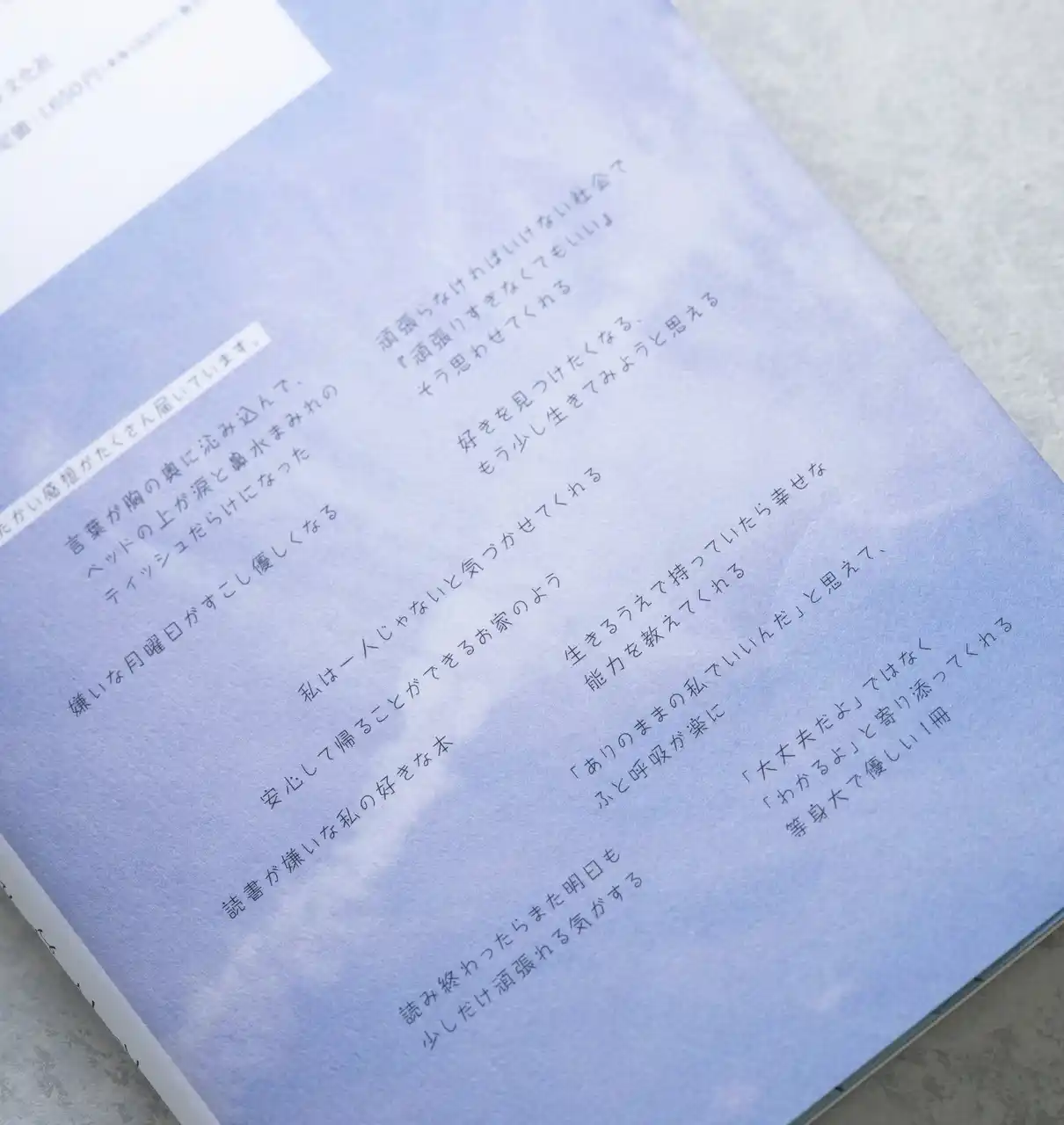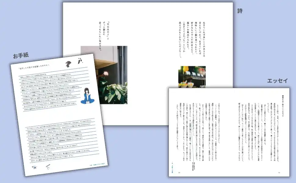 さらに本書では、〔詩〕〔エッセイ〕〔お手紙〕という3つのスタイルで言葉を収録。 休日にゆっくり読むのはもちろん、眠る前に数ページだけ、あるいは気になるところからでも--そのときの気分に寄り添う読み方ができる一冊です。 |