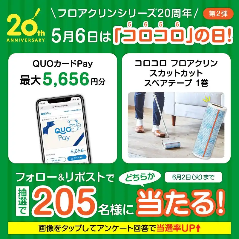 ■コロコロ フロアクリンシリーズ20周年記念 第2弾 5月6日は「コロコロの日」キャンペーン フォロー&リポストで、QUOカードPay 5,656円分 または「コロコロ フロアクリン スカットカット」のスペアテープ1巻が当たる!