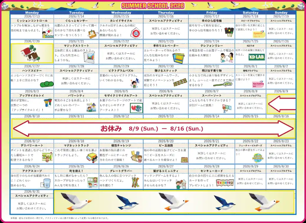 2026年8月10日(月)~8月17日(月)は休校期間です |