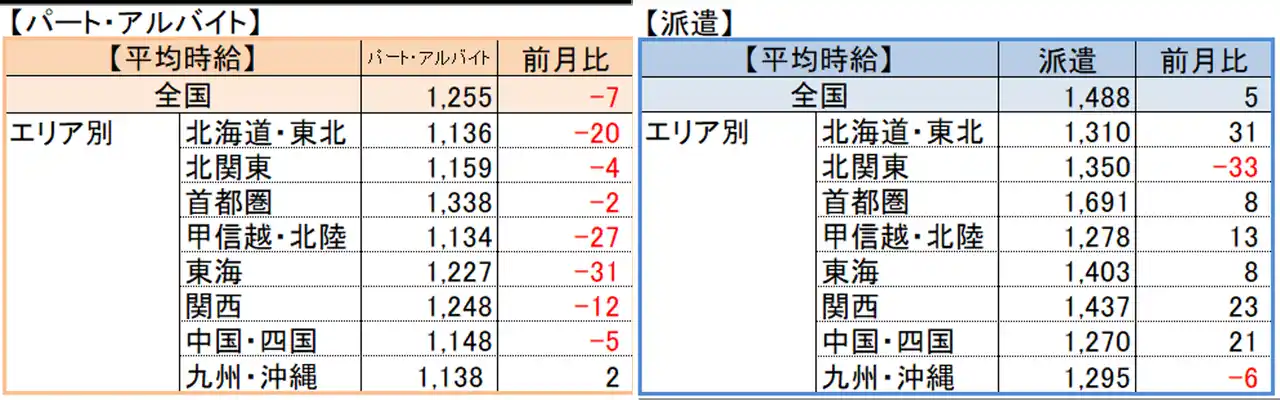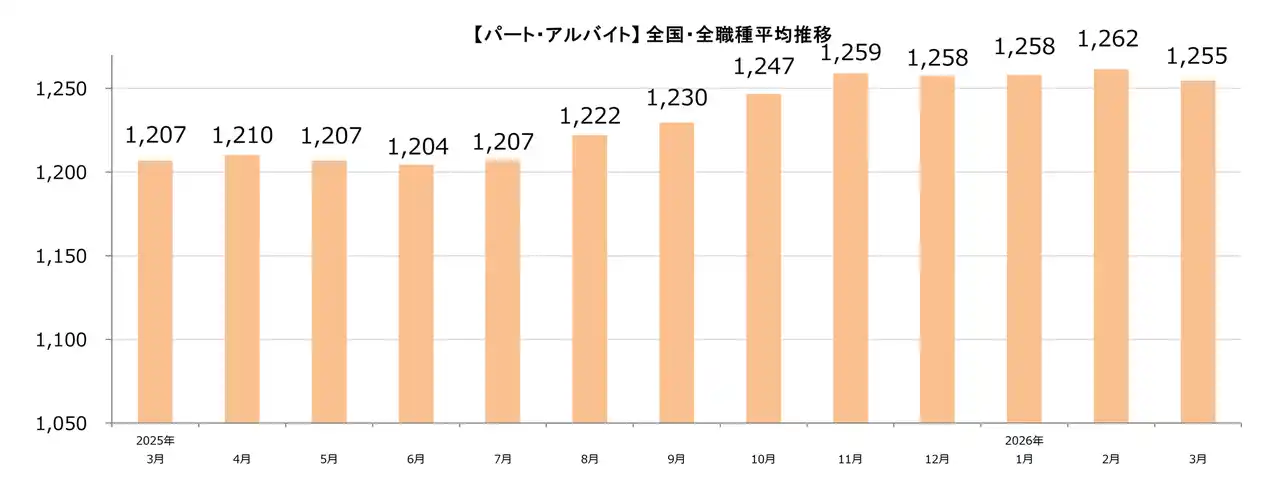 【パート・アルバイト】全国・全職種平均時給は1,255円。前月比-7円。前年同月比+48円。 |