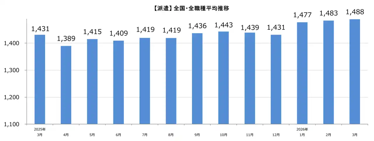 【派遣】全国・全職種平均時給は1,488円。前月比+5円。前年同月比+57円。 |