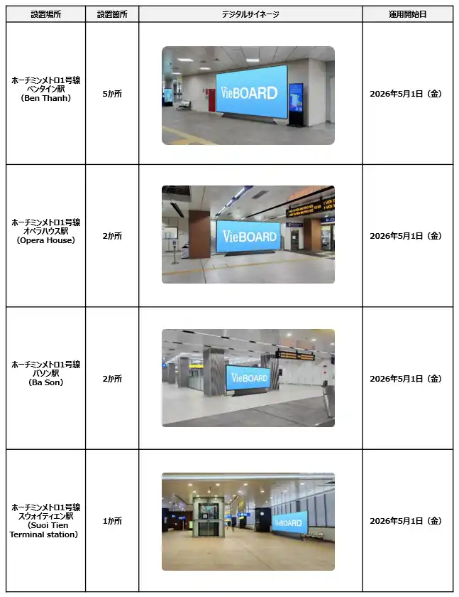 今回Vie BOARDは、ホーチミン市に対して、市内でのデジタルサイネージを活用した文化振興に関する提案を行い、2026年5月1日(金)から順次ホーチミン市内で自社保有のデジタルサイネージの運用を開始する予定です。まずは、ホーチミンメトロ駅構内の10か所にデジタルサイネージを設置し、DOOHの運用を開始します。 |