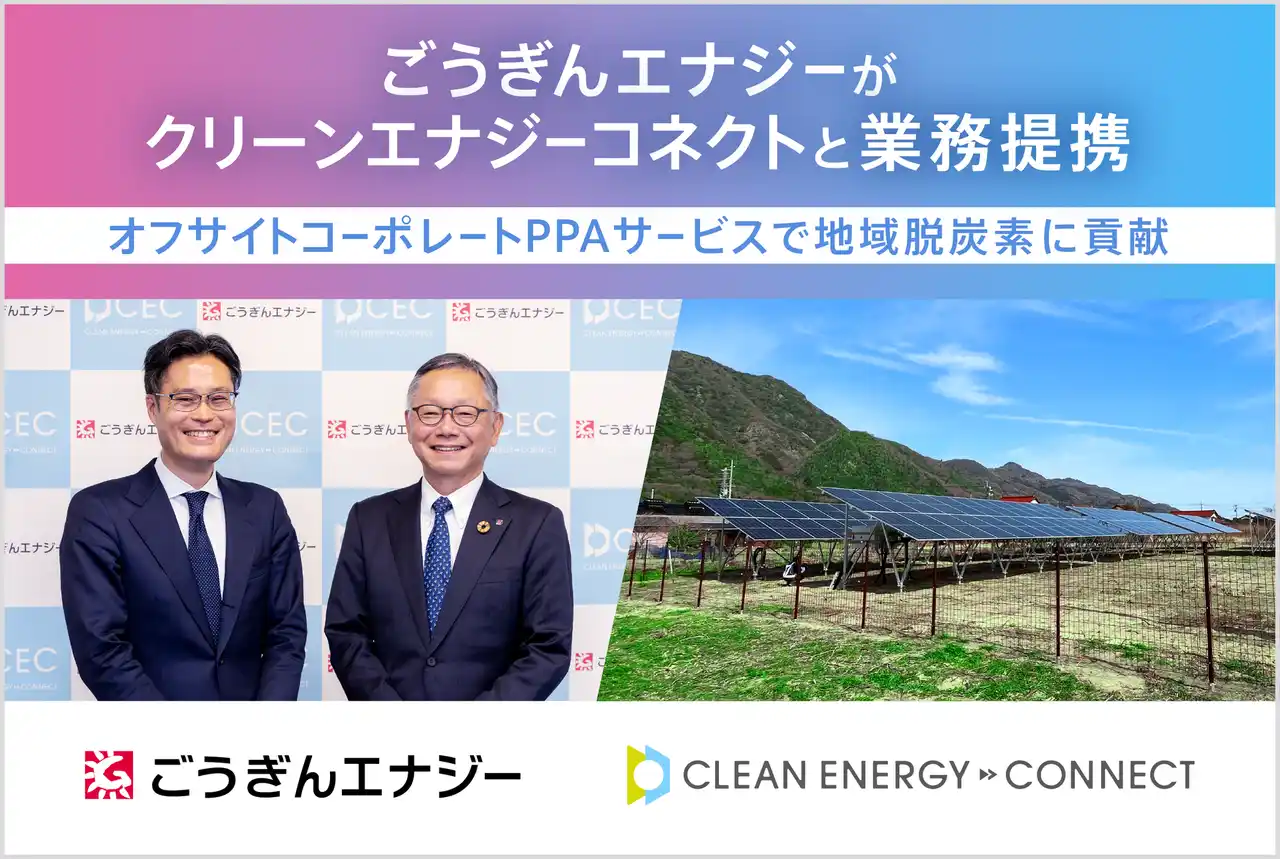 | ごうぎんエナジー株式会社(島根県松江市白潟本町71番地 代表取締役社長 安喰 哲哉、以下「ごうぎんエナジー」という)と株式会社クリーンエナジーコネクト(東京都千代田区大手町2-2-1 代表取締役 内田 鉄平、以下「クリーンエナジーコネクト」という)は、自治体や企業の脱炭素や再生可能エネルギー導入の課題に対し、オフサイトコーポレートPPAサービスを含むグリーン電力ソリューションをご提供することについて、業務提携契約を締結しました。この取り組みにより、両社は、山陰エリアの地域脱炭素の実現に貢献してまいります。 | |||