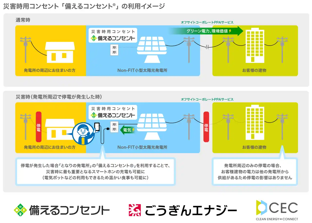 今回開発する山陰合同銀行専用のNon-FIT小型太陽光発電所には、クリーンエナジーコネクトが提供する「備えるコンセント(R)」を導入しています。「備えるコンセント(R)」とは、発電所の設置地域で災害等により停電が発生した際、周辺にお住まいのみなさまが太陽光発電で発電した電気を利用できる、災害時用コンセントです。 ごうぎんエナジーとクリーンエナジーコネクトは、発電所の設置地域における災害時の停電対策(レジリエンス向上)に貢献することを目指します。 |