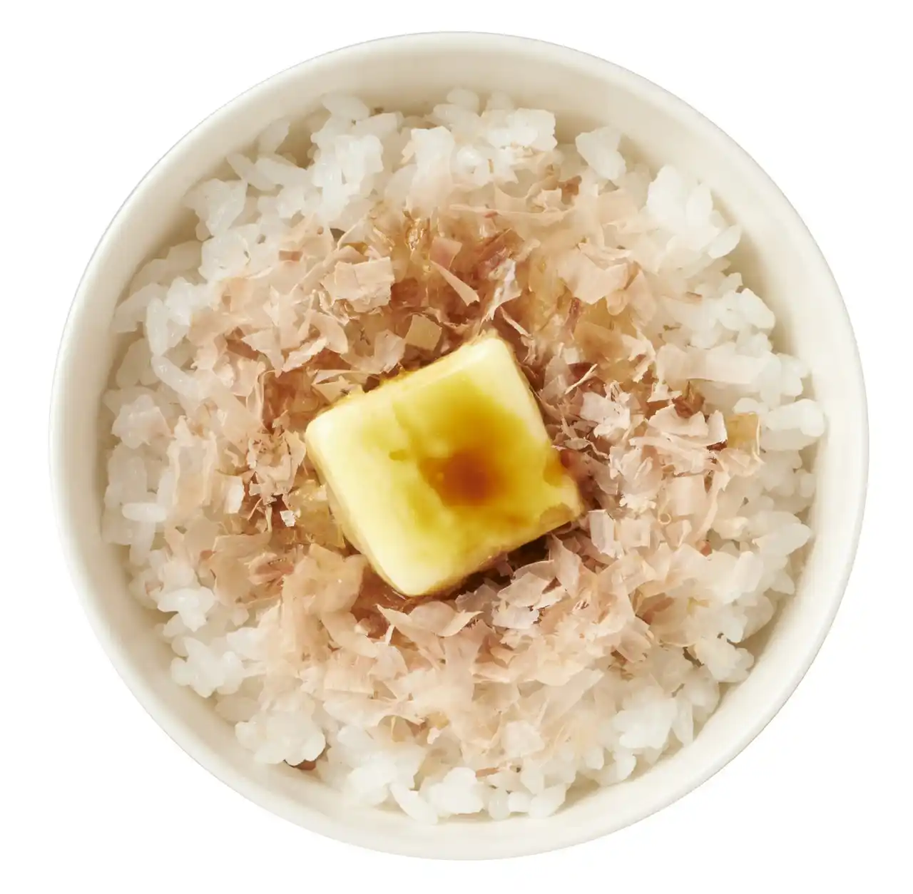 かつぶしめしに辛子明太子と海苔をトッピングしました。辛子明太子の程よい辛味と海苔の香りが、かつお節の旨みを引き立てます。プラス50円で追加できるバタートッピングはぜひお薦めしたい美味しさです。 |