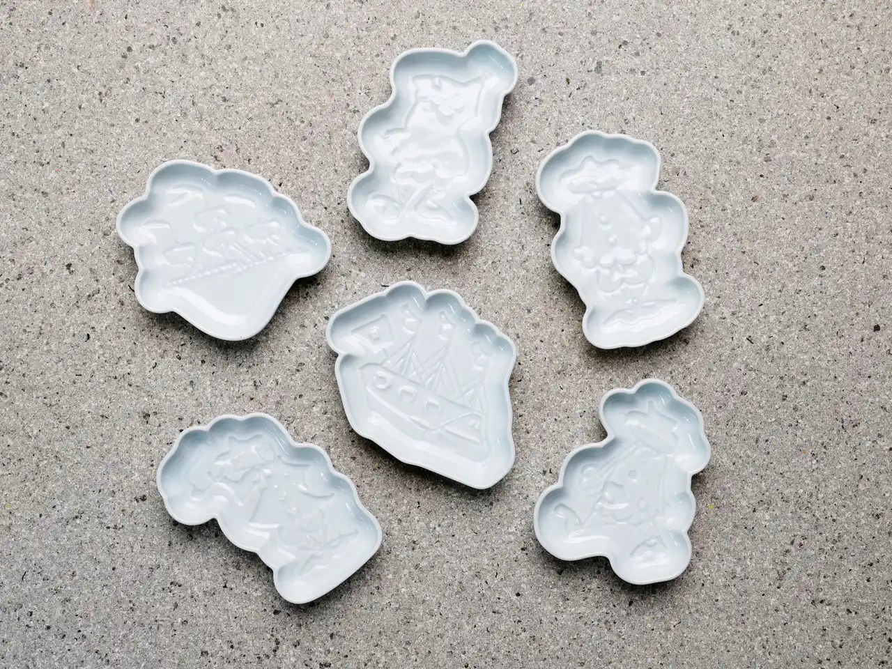 異人や船といった代表的なモチーフを、彫りの深さによる陰影で表現。醤油などを注ぐことで濃淡が際立ち、絵柄が浮かび上がります。 |
