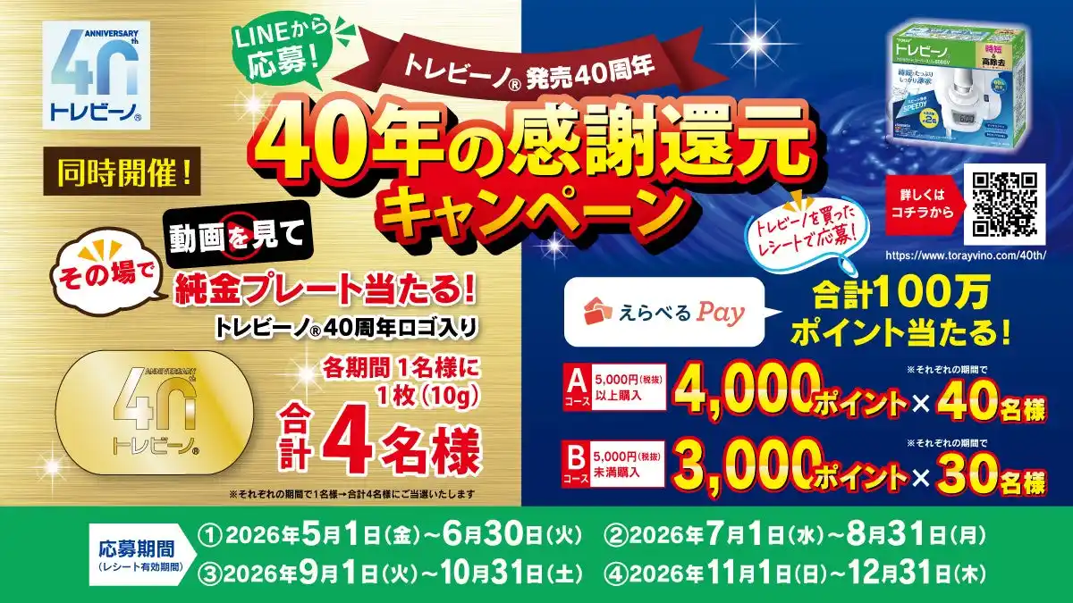 トレビーノ(R)発売40周年を記念し、「40年の感謝還元キャンペーン」を実施します。トレビーノ(R)商品を購入し、LINEから応募いただくと、抽選でえらべるPayポイントが当たります。 |