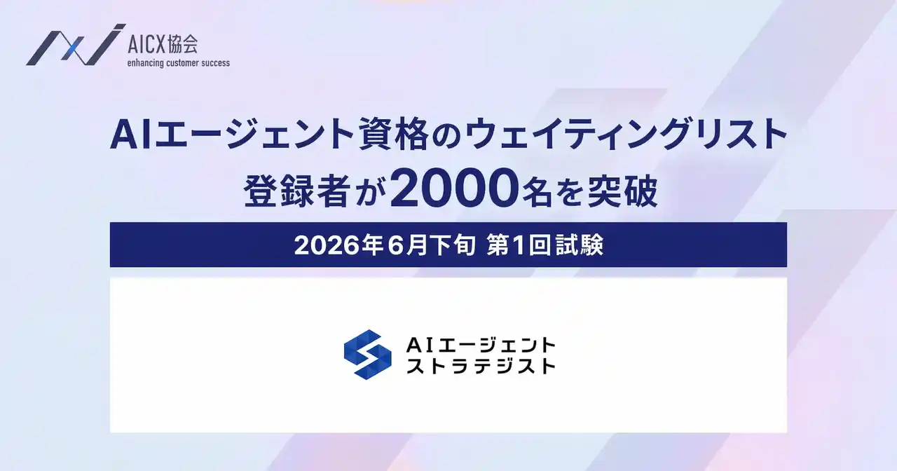 一般社団法人AICX協会(東京都、代表理事:小栗 伸/小澤 健祐、以下、AICX協会)は、2026年2月13日に創設を発表したAIエージェント実装人材向け資格制度「AIエージェント・ストラテジスト」のウェイティングリスト登録数が、2026年4月27日時点で2,000名を突破したことをお知らせいたします。 |