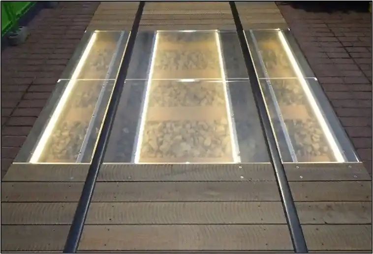 | 旧臨港鉄道で実際に使用されていたレール・枕木等を可能な限り現地で保存し、その上部をアクリル面により安全に閲覧できる構造としています。夜間はライトアップを行い、周辺景観と調和した演出を行うことで新たな観光スポットとしての価値創出につなげます。 | |||||||||