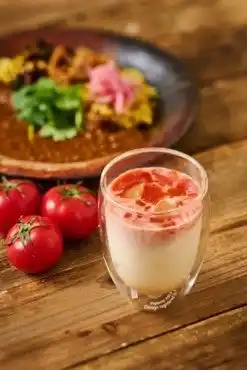 ヨーグルトの爽やかな酸味と甘酒のやさしい甘さをしっかりと感じられる濃厚な味わい。まずはそのままの風味を楽しみ、途中でトマトジュースを加えて味の変化をお楽しみいただけます。スパイスの効いたカレーとの相性も抜群です。