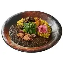 スパイスカレーの奥深い香りに、イカ墨のコクと旨味を掛け合わせた、見た目にもインパクトのある一皿です。