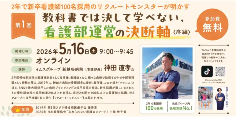 | ~採用数を2年で10倍以上に伸ばした看護部長が登壇。教科書では学べない意思決定の軸を共有する ~ |