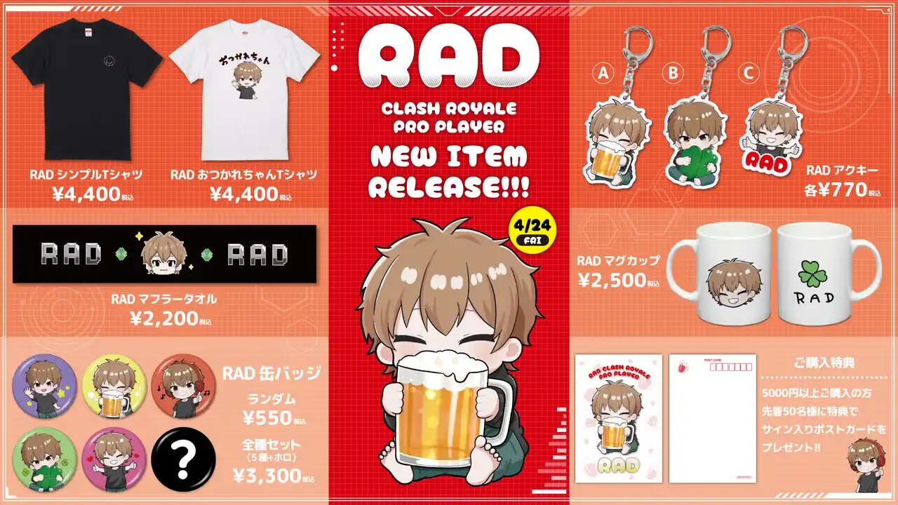 | クリエイターグッズの企画・製造・販売を支援する株式会社メディアリンクは、『RAD shop』にて、FAV gaming所属・ストリーマーでClash Royale(クラロワ)の実況解説で人気を集めるRADのオリジナルグッズの販売を2026年4月24日より開始いたしました。 | |||
