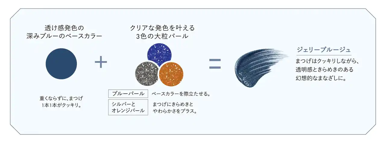 | 深みのあるブルーをベースに、顔料を抑えてパールを高配合。透け感のある発色で、目もとが重たくならず、まつげ1本1本をクッキリと引き立てます。ブルー・シルバー・オレンジの3色の大粒パールをブレンドすることで、白くくすみがちなまつげもクリアな印象に。ブルーパールがベースカラーを際立て、シルバーとオレンジのパールがきらめきとやわらかさを添え、ピュアで繊細な仕上がりに。まつげをクッキリと見せながらも、透明感ときらめきをまとった、幻想的なまなざしに仕上げます。 | ||||||||||