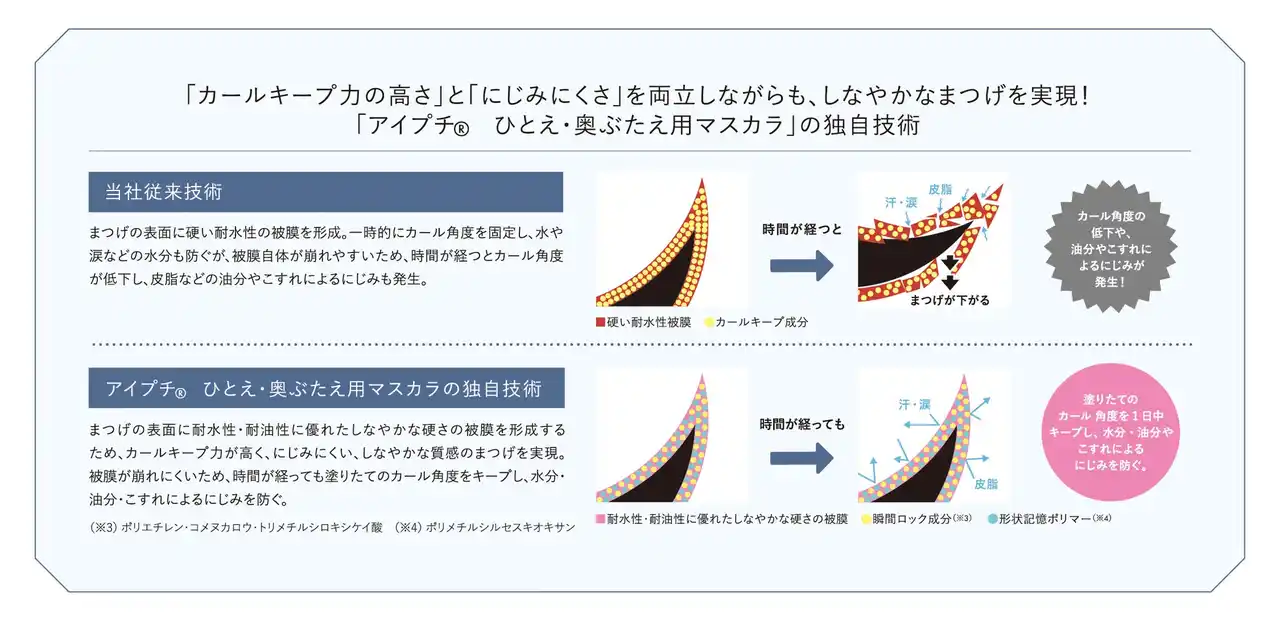 | 【製品特長〈アイプチ(R) ひとえ・奥ぶたえ用マスカラ 全色共通〉】 | ||||||||||