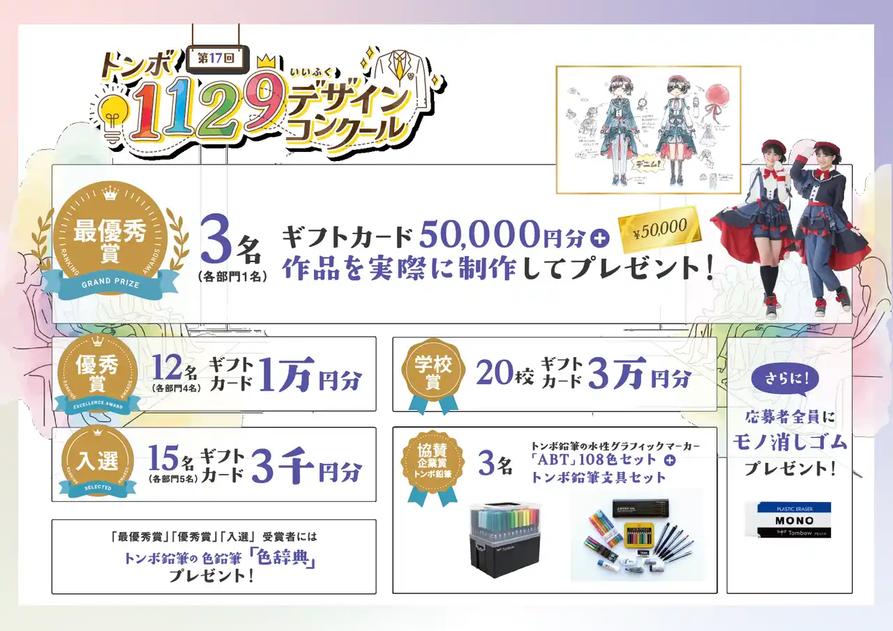 また、前回に引き続き、同じ「トンボ」の社名の文房具メーカー、株式会社トンボ鉛筆(本社:東京都北区)様とコラボレーションいたします。「学校生活がより素晴らしいものになるように」との共通の願いを込め、本年度も協賛企業賞『トンボ鉛筆賞』を設置。副賞として同社製品をご提供いただくなど、強力なバックアップをいただいております。 |