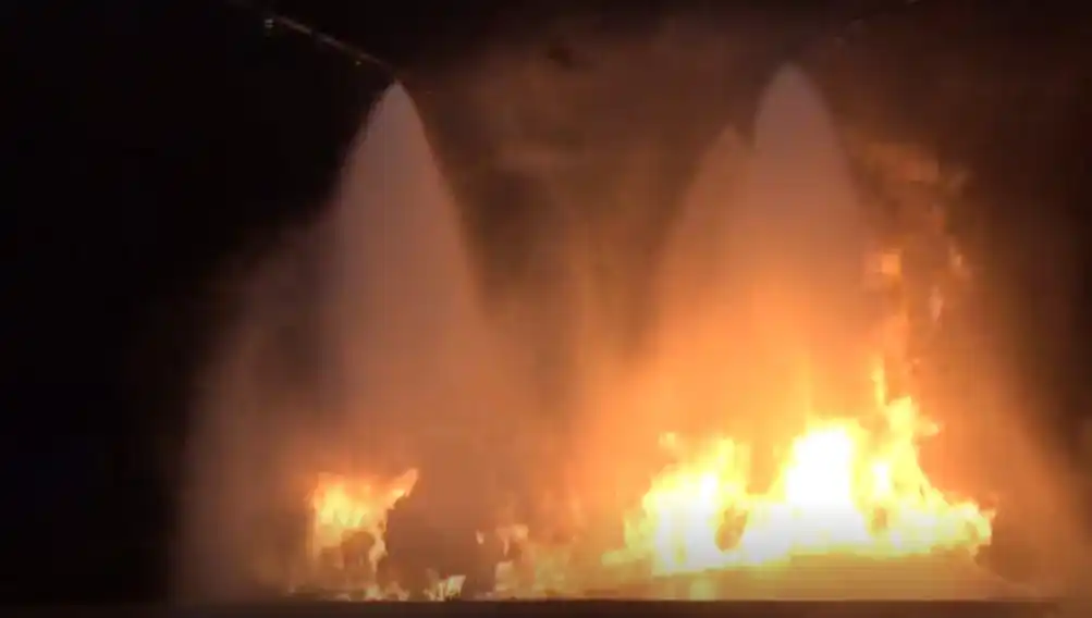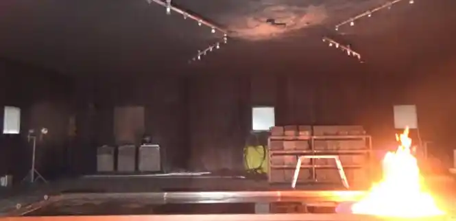 | 燃料火災を想定した消火試験において、本泡消火ヘッドを複数台天井設置した構成で検証を実施しました。その結果、燃料流出を伴う火災条件下において、20 秒以下という短時間での消火を確認しました。本試験により、本技術が迅速な初期消火に有効であることが確認されています。 | |||||||||