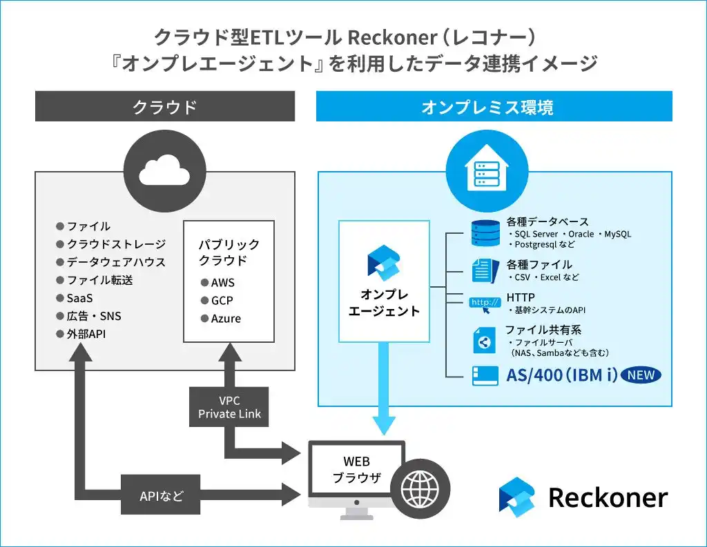 「Reckoner」サービスサイト:https://reckoner.io/ ■背景 製造業や流通業を中心に、AS/400(IBM i)は現在も多くの企業において基幹システムとして稼働しています。一方で、クラウドサービスや分析基盤の普及により、これらのシステムとのデータ連携の必要性は年々高まっています。 しかしながら、従来のデータ連携では、エンジニアによる個別開発や専門的な環境構築を前提とするケースが多く、データ連携の実装や立ち上げに多くの工数を要するという課題がありました。さらに、構築後の運用においても、設定変更や改善対応が特定のエンジニアに依存しやすく、現場での柔軟な対応が難しいといった課題が生じていました。 |