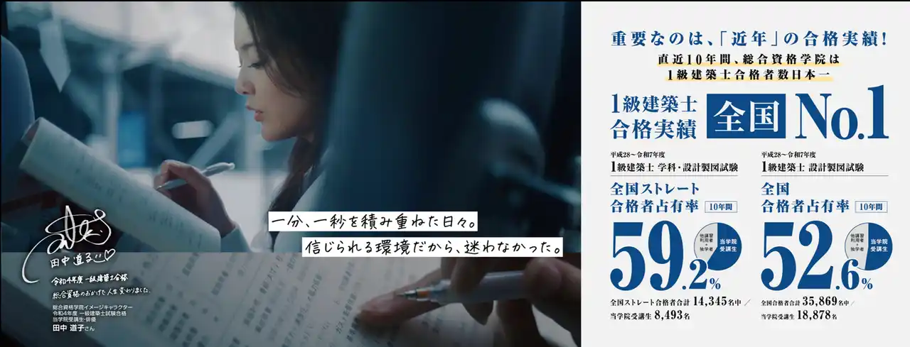 総合資格学院の講座は、「圧倒的な高い分析力」に基づき構成されており、難化著しい近年の試験に対応できるよう、社会情勢、試験傾向、最新技術など様々な要素を徹底分析し、講習システム・講座カリキュラム・教材等の強化を実施するなど、継続的な試験対策に取り組んでいます。その結果、近年(平成28~令和7年度の直近10年間)の1級建築士設計製図試験において、合格者の52.6%(全国合格者合計35,869名中/当学院受講生18,878名)を、また、学科試験と設計製図試験を1年で合格したストレート合格者の59.2%(全国ストレート合格者合計14,345名中/当学院受講生8,493名)を当学院受講生が占め、「日本一」の合格実績となっています(令和7年12月24日現在)。 |