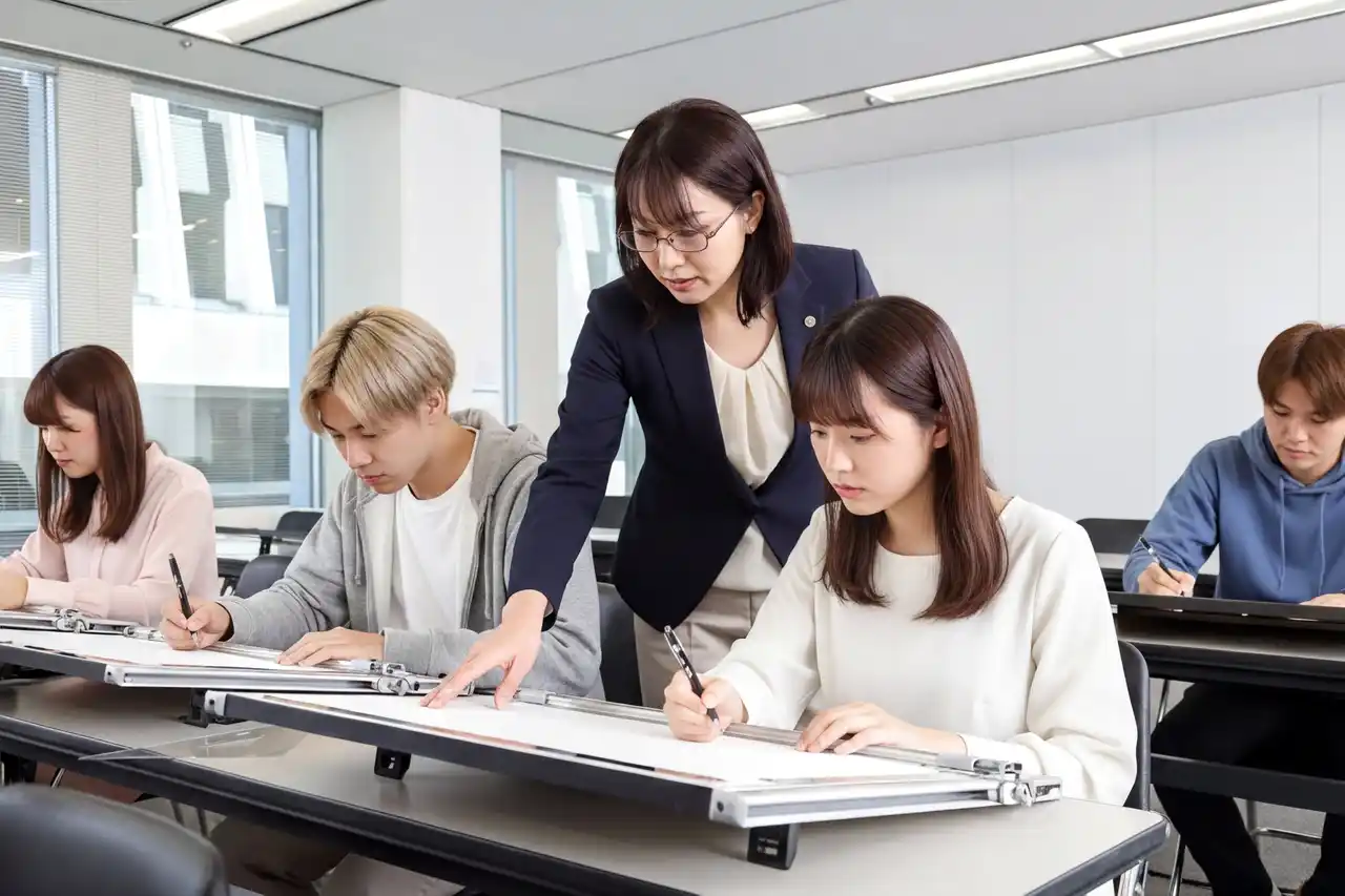 作図手順の指導を段階ごとに行い、作図途中の手元は講師が教室を巡回し確認します。 |