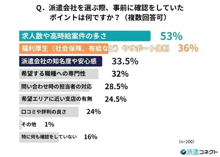 | 「Q.派遣会社を選ぶ際、事前に確認をしていたポイントは何ですか?」という問いでは、「求人数や高時給案件の多さ」が53%と最も多い結果でした。「その他」の自由記述でも、「募集している仕事の内容」や「自分の希望条件の求人が豊富か」という回答が入り、派遣会社選びにおいて実利を最優先するリアルな姿勢が確認できます。 | ||||||||||||