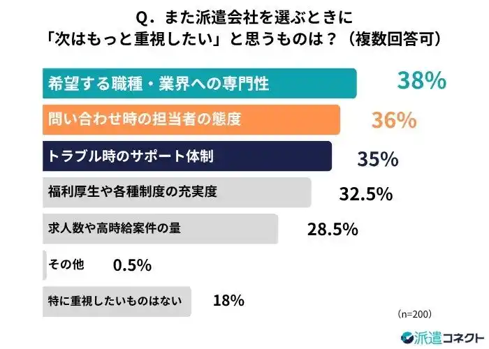 | さらに注目すべきは、派遣会社を利用した経験を経て、「次選ぶ際に重視したいポイント」に変化が現れている点です。登録の入り口では、条件面や求人数が最大の決め手となる一方で、次回選ぶ際の重視項目として「問い合わせ時の担当者の態度」や「トラブル時のサポート体制」が上位に急浮上しており、親身な対応や日々の信頼関係といった「人的サポートの質」が不可欠な要素として再認識されていることがわかります。 | ||||||||||||