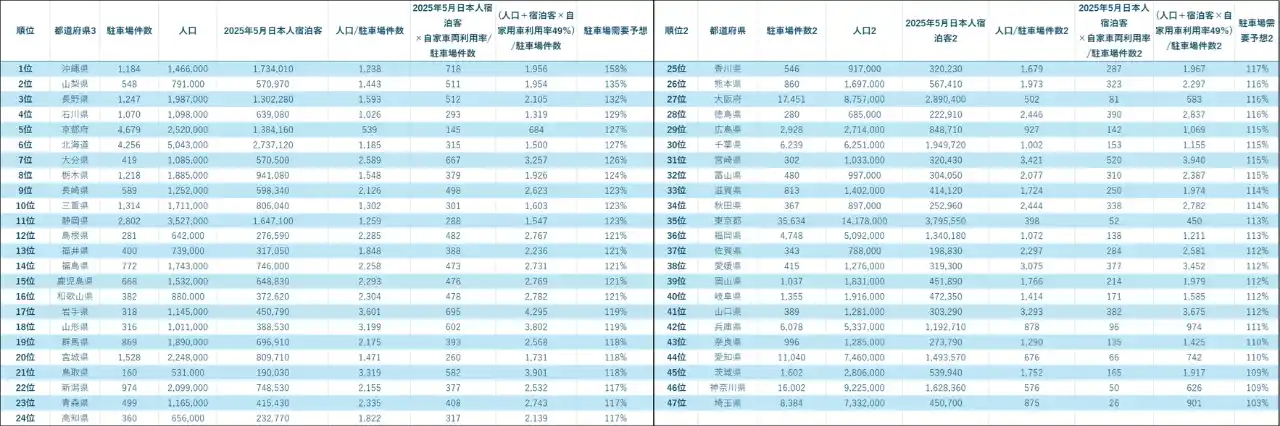 | 今回の分析では、「安・近・短」志向が強まることで、山梨県・長野県・栃木県といった首都圏近郊の観光地や、沖縄県・京都府・北海道といった人気観光地に需要が集中する傾向が見られました。これらの地域では、公共交通機関よりも車移動が選択されやすく、駐車場不足が発生する可能性がボトルネックとなる構造が浮き彫りになっています。 | |||