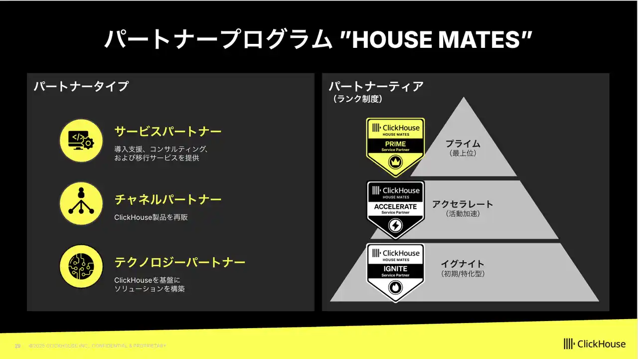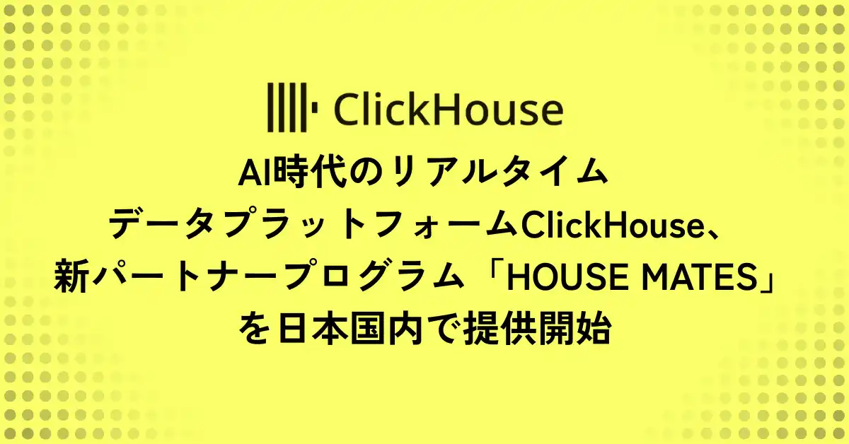AI時代のリアルタイムデータプラットフォームのリーディングカンパニーであるClickHouse株式会社(本社:東京都港区、代表取締役社長:金古 毅、以下ClickHouse)は、パートナー企業との連携を強化し、顧客への最適なソリューション提供を目的とした新しいグローバルパートナープログラム「HOUSE MATES」を発表いたしました。本プログラムは、本日より日本国内のパートナー企業に対しても正式に適用を開始いたします。 |