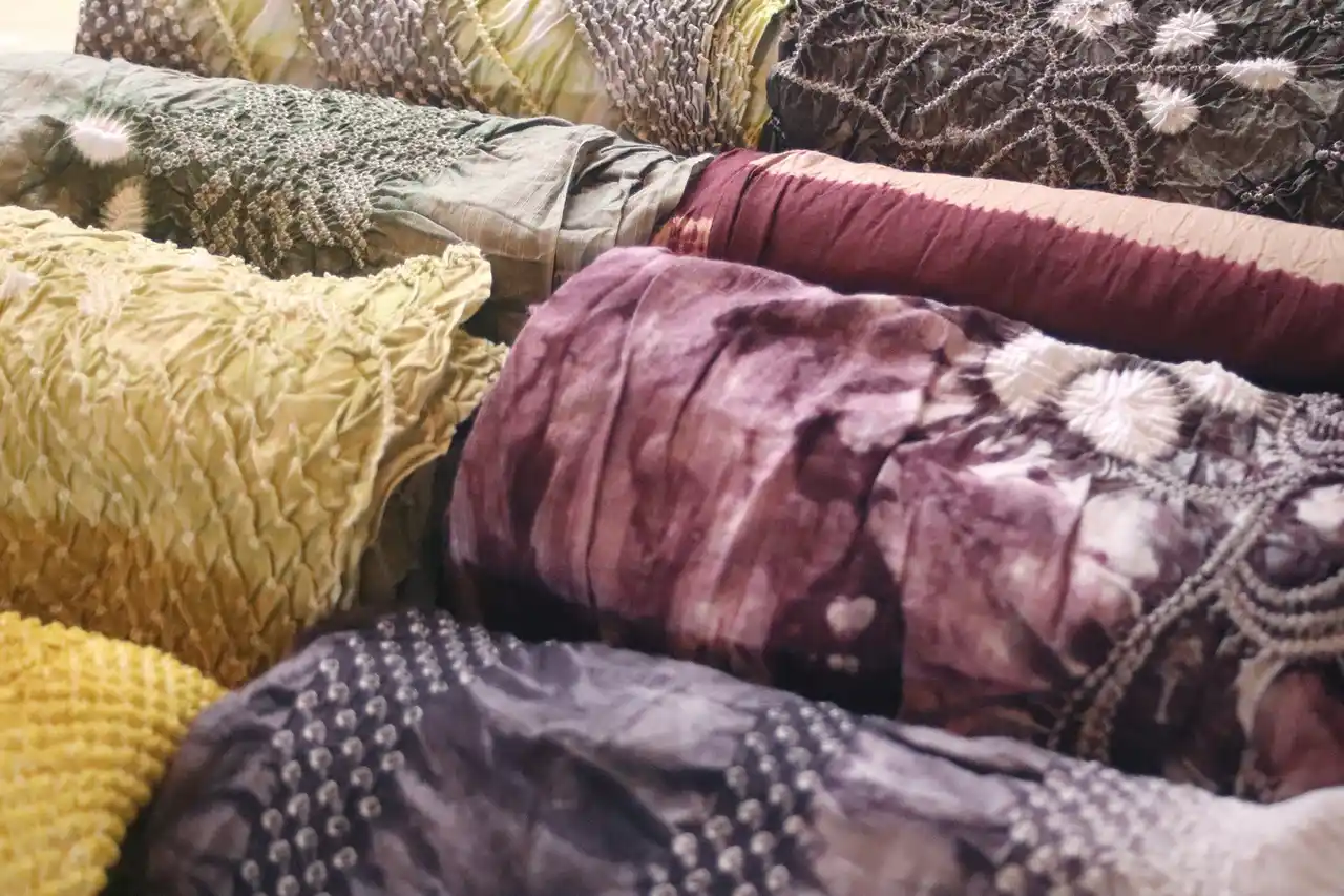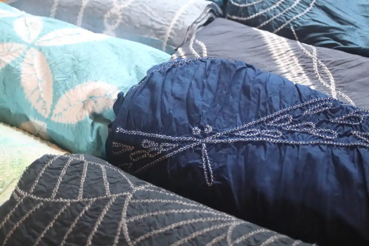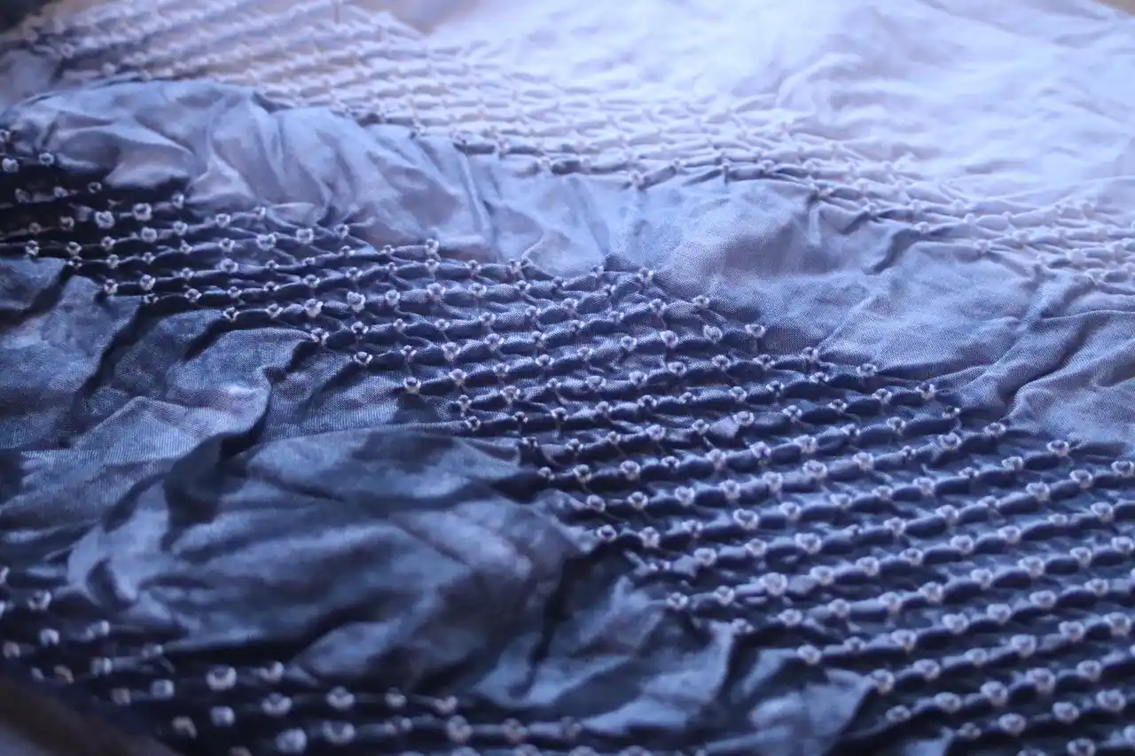 布の括り方、縫い方、ヒダの取り方によって、多彩な模様を表現することができ、有松鳴海地区では「括り」の種類が100種を超えるとも言われ、現在は約70種類の技術が受け継がれています。 |