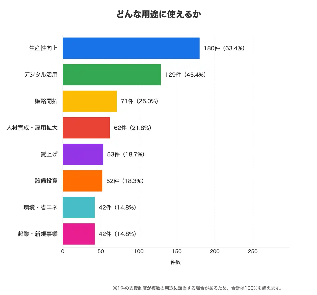 | 用途別では「生産性向上」が約6割、「デジタル活用」が約4割で並びます。両用途を兼ねる制度が106件あり、業務効率化とデジタル化を一体で進めたい場合は両用途を指定して候補を絞る方法が取れます。 | ||||||||||||||