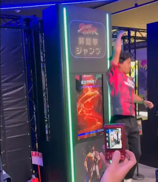 リュウやケンになりきって、おなじみの必殺技「昇龍拳」にチャレンジ!どこまで高くジャンプできるかを測ります。 |