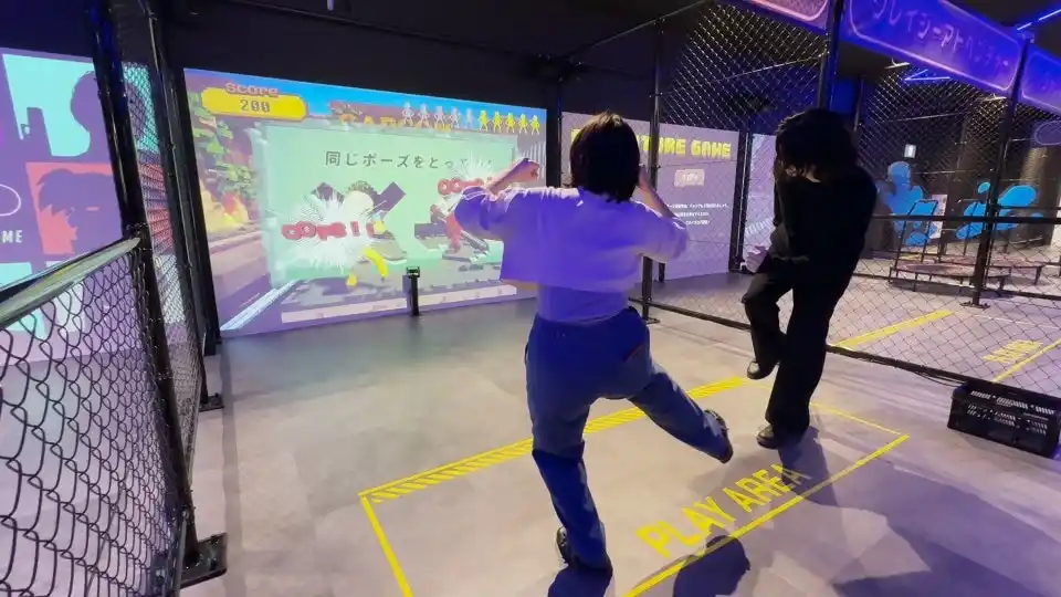 スクリーンに現れるカプコンのキャラクターと同じポーズをとって壁を抜けるアクティビティゲーム! |