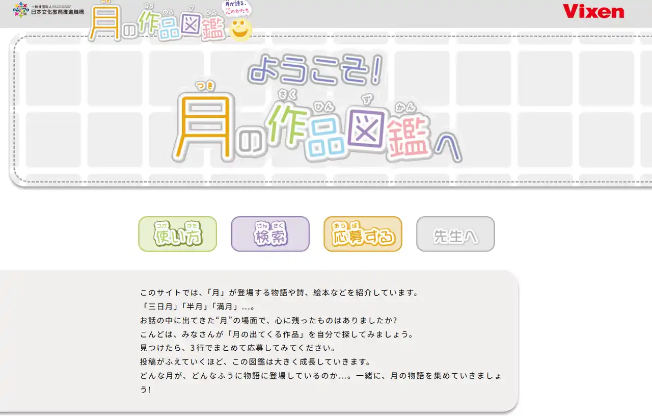 一般社団法人日本文化教育推進機構(所在地:東京都中央区、代表理事:田代 綾)は、株式会社ビクセン(所在地:埼玉県所沢市、代表取締役社長:新妻和重)の協力のもと、小学校3~6年生を対象とした無料プログラム「月があらわす心や気持ち」について、2026年4月27日より授業実施校の受付を開始いたします。 |