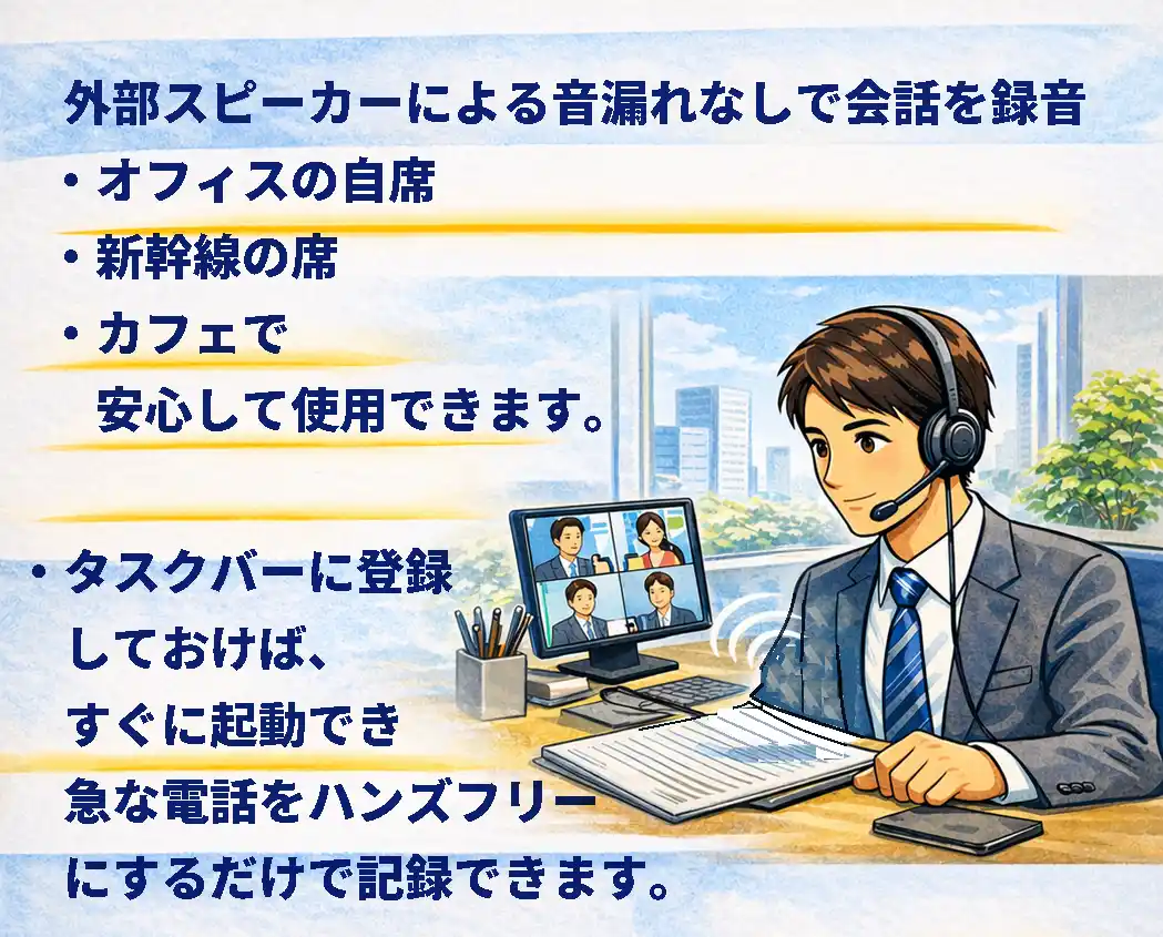 ※ICレコーダー・ボイスレコーダーアプリは外部スピーカーからの音声を録音します。周りに会話を聞かせたくないヘッドセット着用時は会話を録音できません。この課題を解決しました。 |