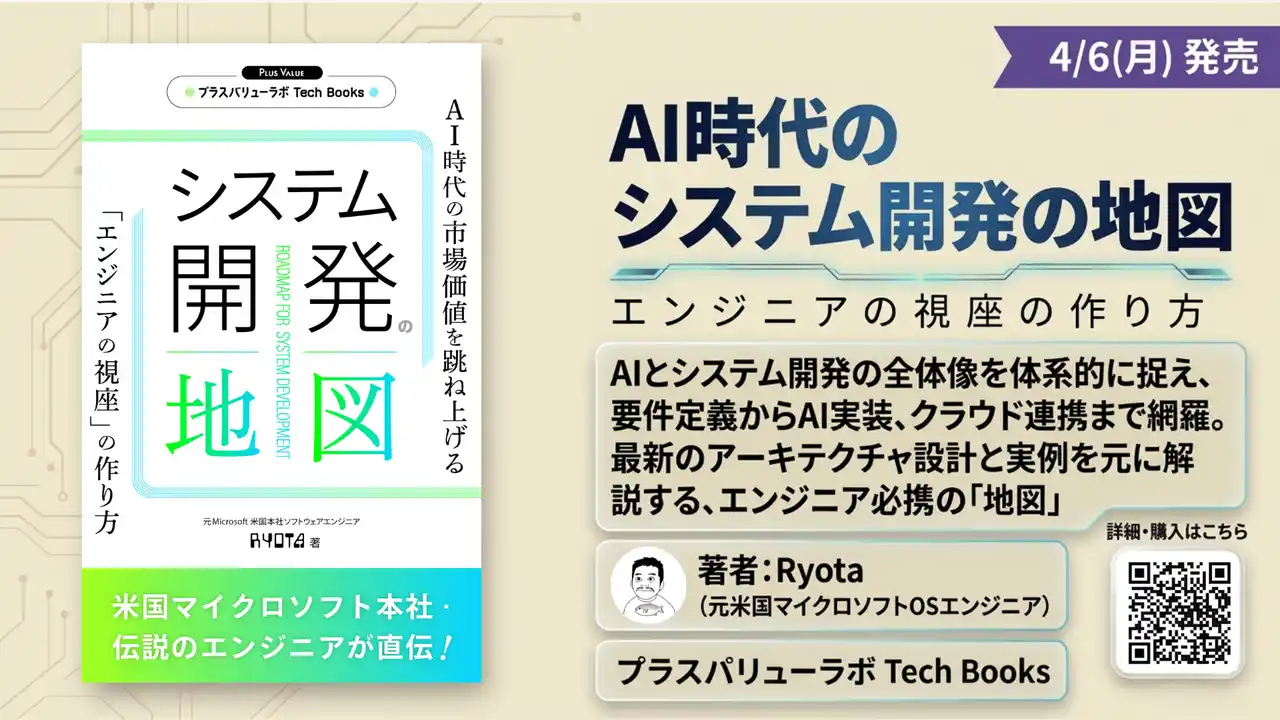 | 株式会社プラスバリュー(本社:東京都、代表取締役:沓澤寿子)は、プラスバリューラボ Tech Booksより、新刊『システム開発の地図 ― AI時代の市場価値を跳ね上げる「エンジニアの視座」の作り方』(著者:Ryota)を発刊したことをお知らせいたします。 | |||||||||||||