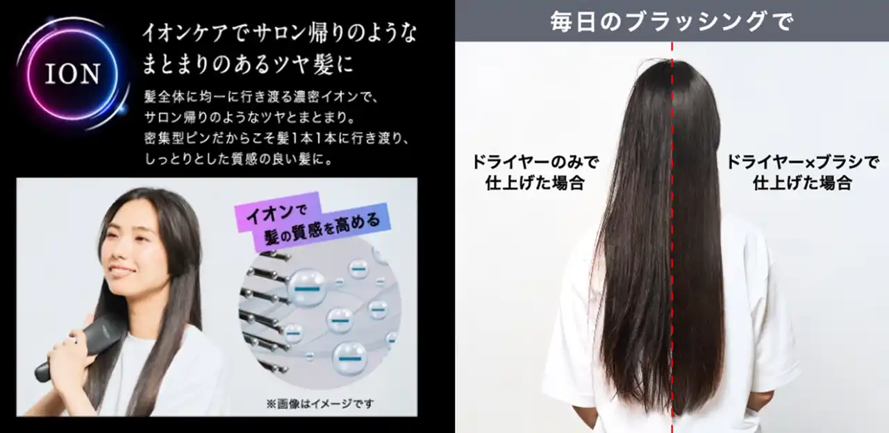 密集型ピンだからこそ髪1本1本にイオンが密着し、質感の良い髪に。 |