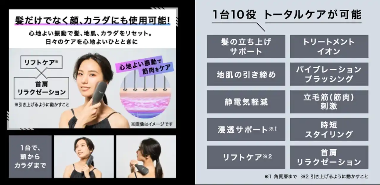 「スカルプD ネクストプラス」が展開するヘアケアデバイス「スカルプD ネクストプラス スタイルエレブラシ」は、EMS×イオン×バイブレーションの多機能を備えた、サロン級のヘアスタイリングを叶えるヘアケアデバイスです。髪や頭皮のみならず、顔、体にも使用することができ、マルチケアデバイスとしても注目を集めています。男女問わずユニセックスアイテムとして好評いただき、一時品薄状態となりました。 |