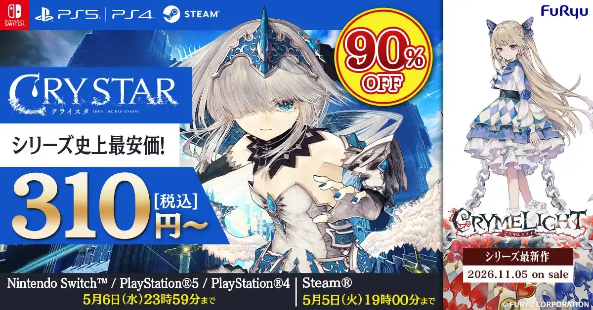 さらに、本発表を記念してPlayStation(R)5/PlayStation(R)4/Nintendo Switch(TM)/Steam(R)向けに、現在発売中のダウンロード版『CRYSTAR -クライスタ-』が史上最安となる310円からお買い求めいただける記念セールを各プラットフォームにて順次開催中です。この機会にぜひ、お得な価格でお楽しみください。 |